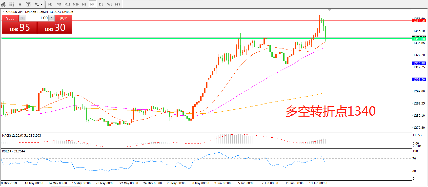 周五现货黄金亚市早盘开于1342.01美元/盎司后维持窄幅交投,随后小幅上涨。欧市开盘后,现货黄金短线拉升逾10美元,刷新日高至1358.04美元/盎司,随后在高位维持窄幅交投。美市开盘后,金价自日高略下方急剧下滑近10美元,最终收报1340.96美元/盎司。市场预期美联储今年将至少降息两次,现货黄金一度逼近1360关口,刷新自2018年4月13日来高位。但随后因乐观的美国零售销售增长,美元大幅走高,导致金价回落,过快的涨势使得黄金短时间存在回调的需要。
