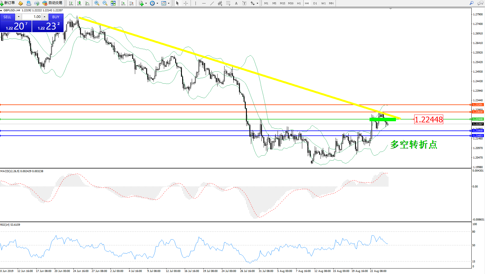 交易策略:1.22448下方看跌,目标1.21858、1.21603