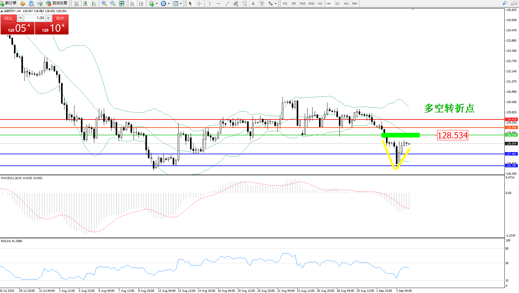 交易策略:128.534下方看跌,目标127.467126.787