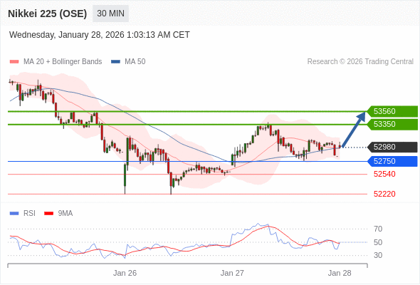 在 52750 之上,看涨,目标价位为 53350 ,然后为 53560 。