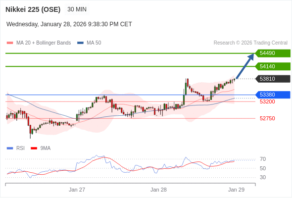 在 53380 之上,看涨,目标价位为 54140 ,然后为 54490 。