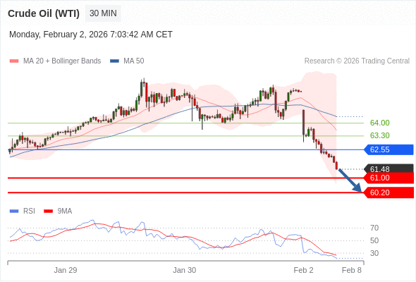 在 62.55 之下,看跌,目标价位为 61.00 ,然后为 60.20 。