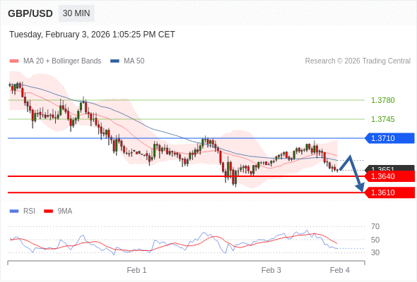 交易策略: 在 1.3710 之下,看跌,目标价位为 1.3640 ,然后为 1.3610 。