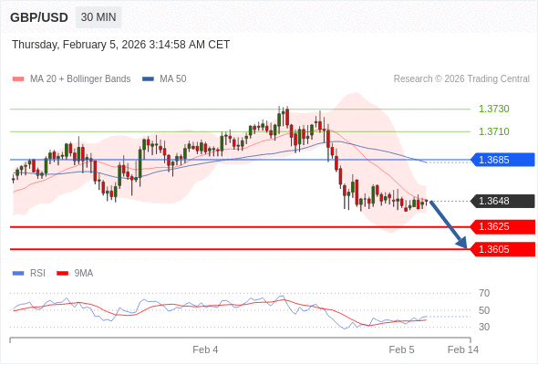 在 1.3685 之下,看跌,目标价位为 1.3625 ,然后为 1.3605 。