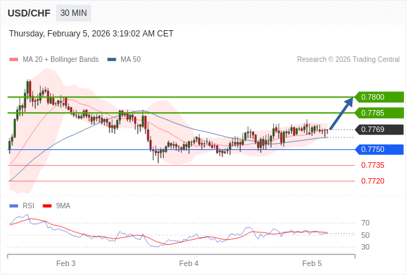 在 0.7750 之上,看涨,目标价位为 0.7785 ,然后为 0.7800 。