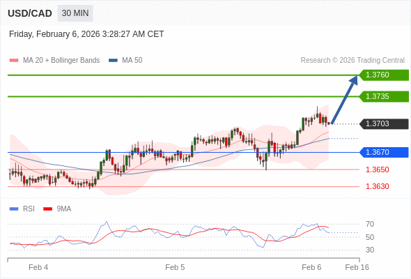 在 1.3670 之上,看涨,目标价位为 1.3735 ,然后为 1.3760 。