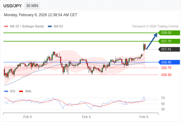 在 156.95 之上,看涨,目标价位为 157.70 ,然后为 158.00 。