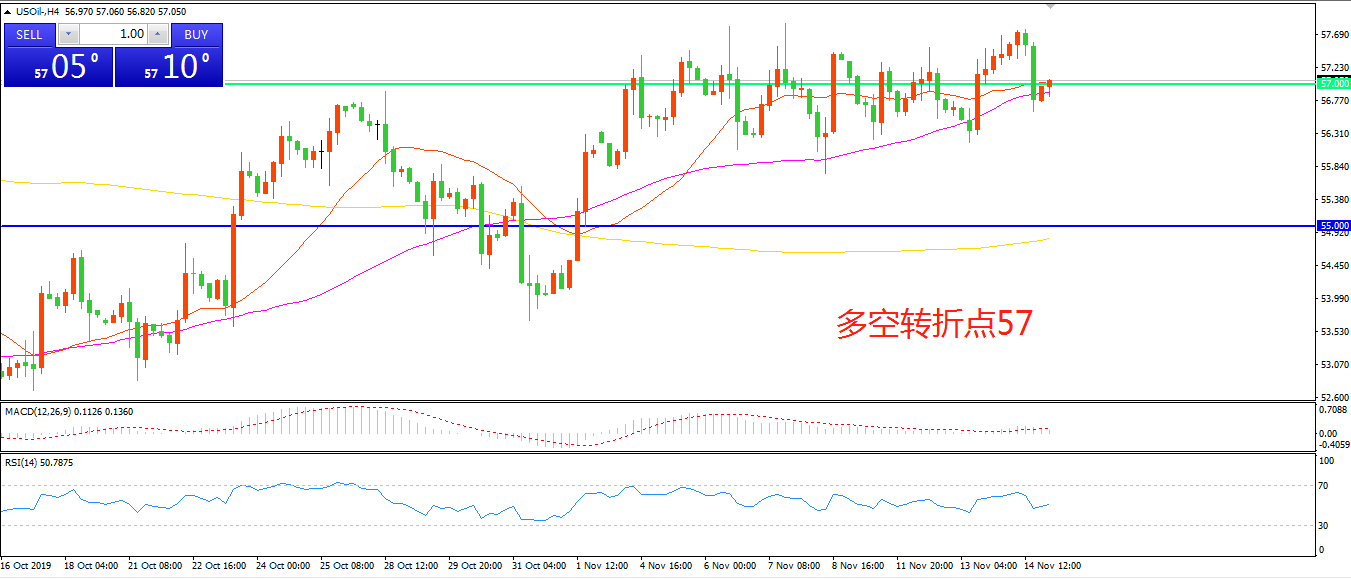 周四(11月16日),美国能源信息署(EIA)周四表示,上周美国原油库存增加220万桶,高于市场预期的164.9万桶,利空油价。美油短线急速下挫,随后小幅反弹,最终收报57.03美元/桶。OPEC早些时候表示,预计2020年对其石油的需求将下降,接连不断的利空消息为近期高歌猛进的多头泼了一盆凉水。