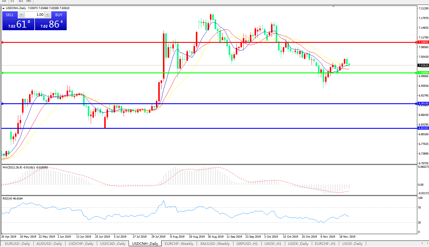 技术面简析:日图均线有逐步走出多头排列的迹象,汇价站稳7.0关口后窄幅整理,MACD运行于0轴下方且量能持续收缩,RSI再度开始走弱,预计短期汇价将在7.0关口附近维持整理,中期汇价需等待美元指数及中美贸易谈判进展指引。