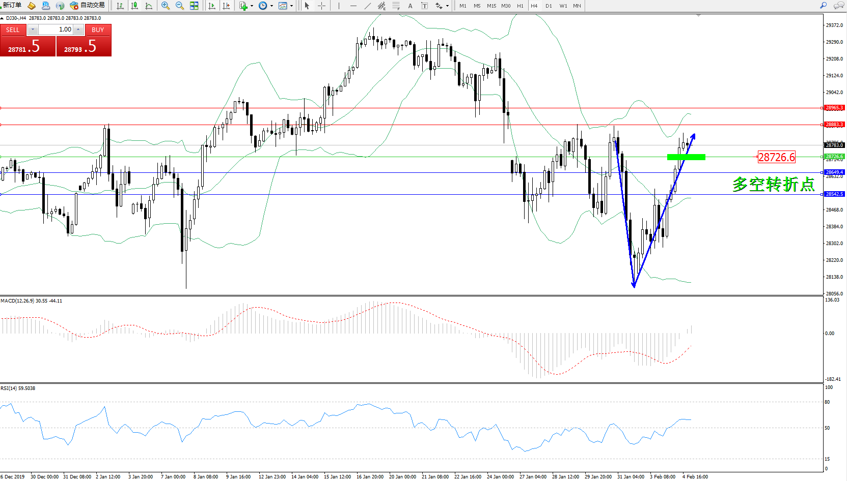 道琼斯指数DJ30—— 4小时K线图显示: