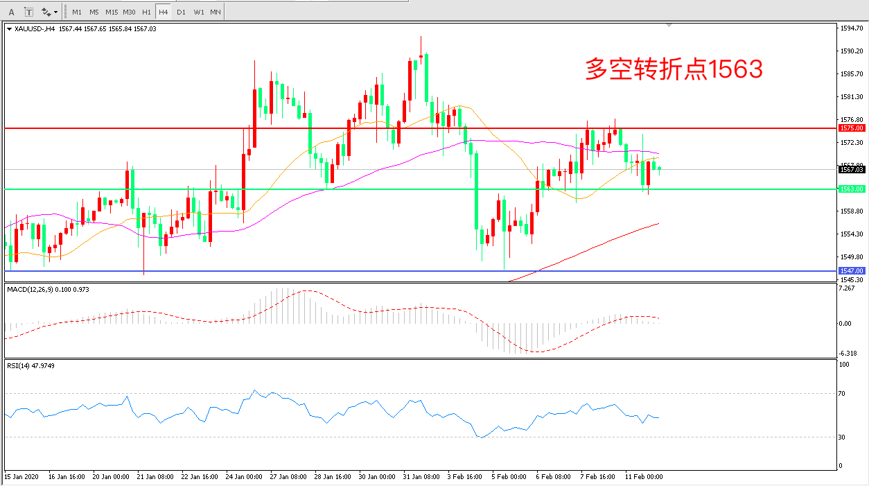 4小时图看,金价呈现区间震荡形态上方阻力为1575下方支撑为1563,均线系统走平, MACD红柱缩短RSI指标走平日内延续上行概率较大。