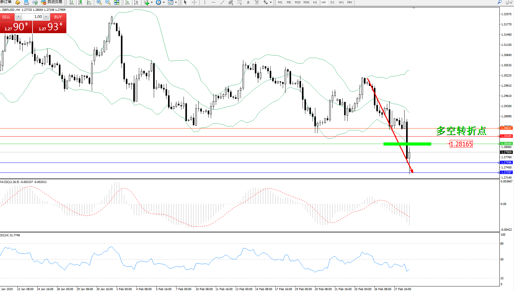 交易策略:1.28165下方看跌,目标1.27596、1.27297