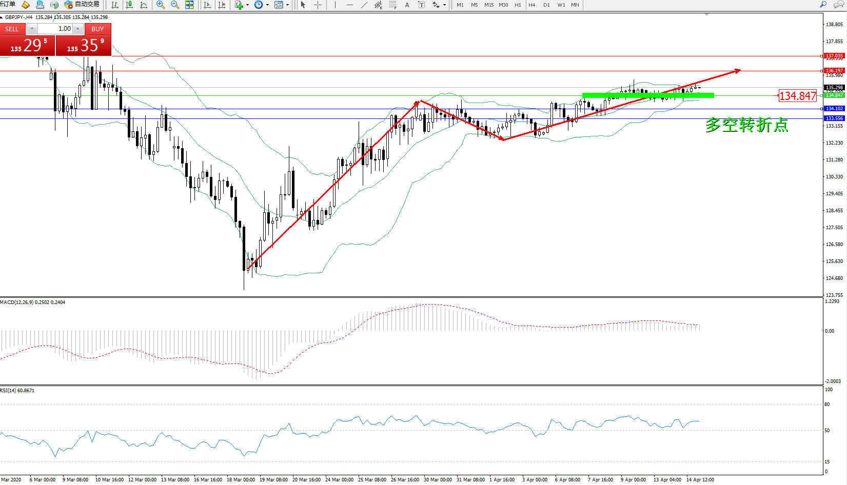 交易策略:134.847上方看涨,目标136.197137.035