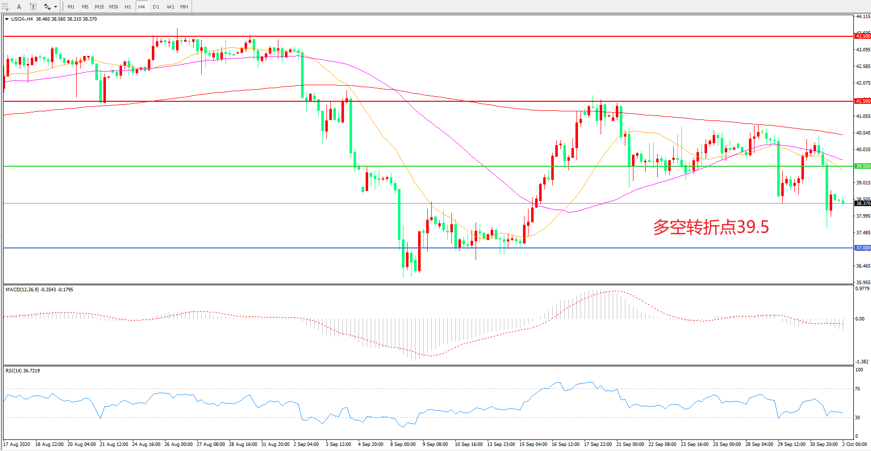交易策略:在39.50之下看跌,目标37.00 35.00