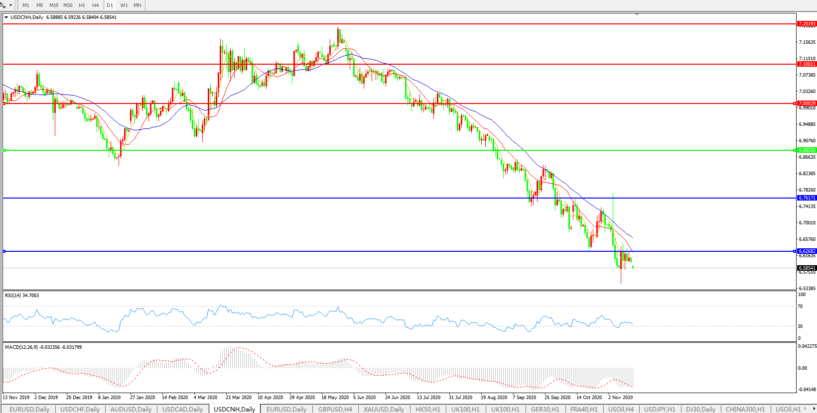 美元兑人民币USDCNH 日线图: