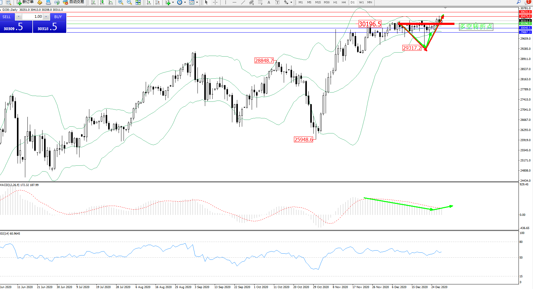 交易策略:30196上方看涨,目标30475、30631