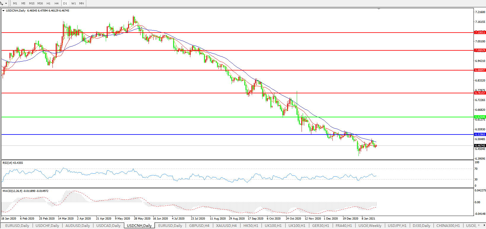 美元兑人民币USDCNH 日线图: