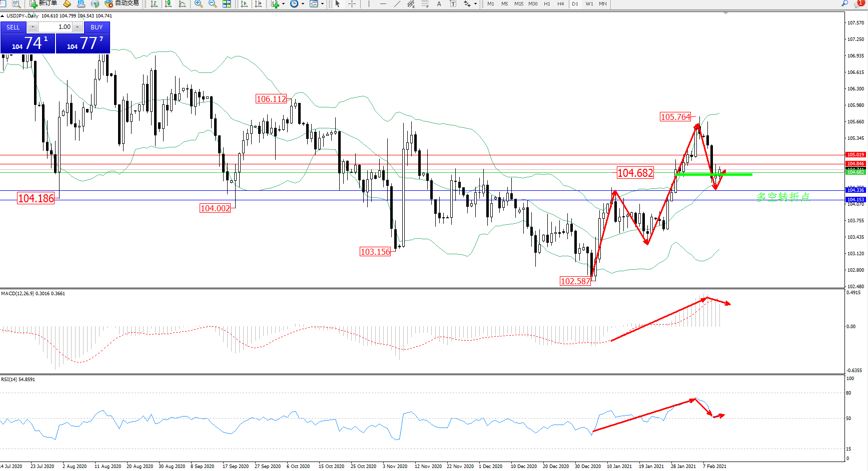 美元兑日圆处于104.741附近整理,因日内缺少进一步的市场风险消息指引,在日本以外多数亚洲市场因为农历新年假期休市的大背景下,汇市波动空间受限。业内分析师预估短线在缺少更多消息指引的背景下,美元兑日元将在窄幅区间内继续震荡,行情上下限分别是104.95和104.40,突破后或将有新一轮的跟进行情。美国方面公布了市场关注的2月6日当周初请失业金人数数据,该数据79.30万人,超出预期。在该数据公布之后,现货金价短线小幅上涨1美元。随着新冠疫情持续蔓延,美国就业市场复苏的脚步正在放缓。