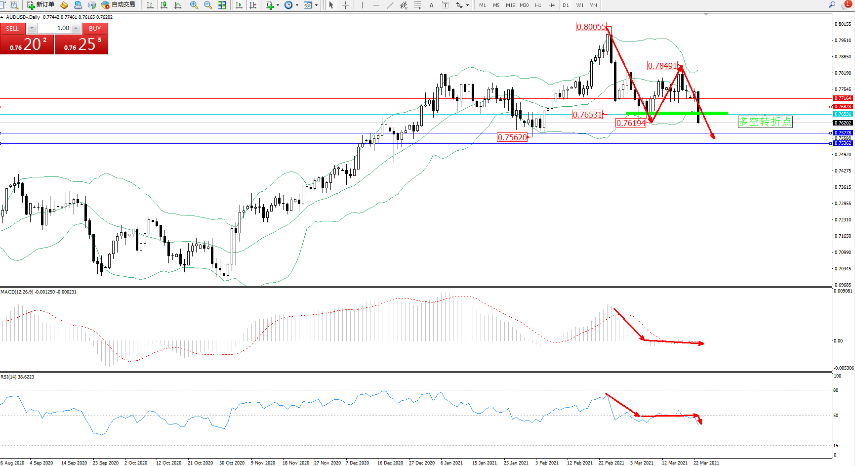 交易策略:0.76531下方看跌,目标0.75778、0.75362