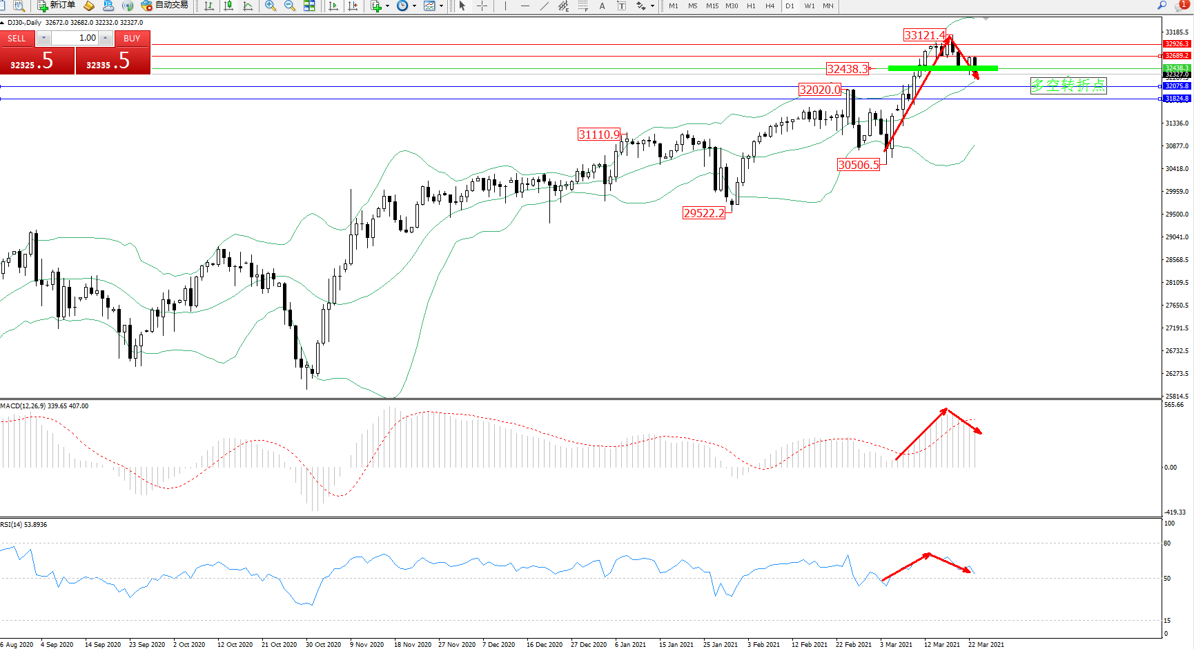 技术点评:多头动力延续布林带指标上轨附近节点持续震荡上扬,高位抵达33121附近节点后遇阻出现回撤,即将触及布林带指标中轨附近节点,空头动力有进一步向下移动迹象,布林带指标呈张口走势后开始收口,MACD指标处于多头区域维持整理有缓慢下移迹象,RSI指标处于多头区域维持整理缓慢下行;
