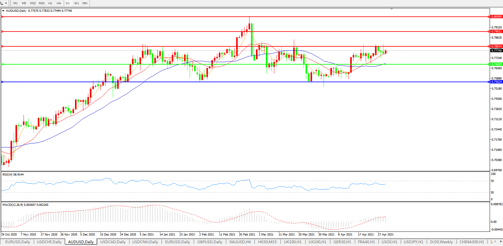 交易策略:0.7680上方看涨,目标0.7800、0.7900