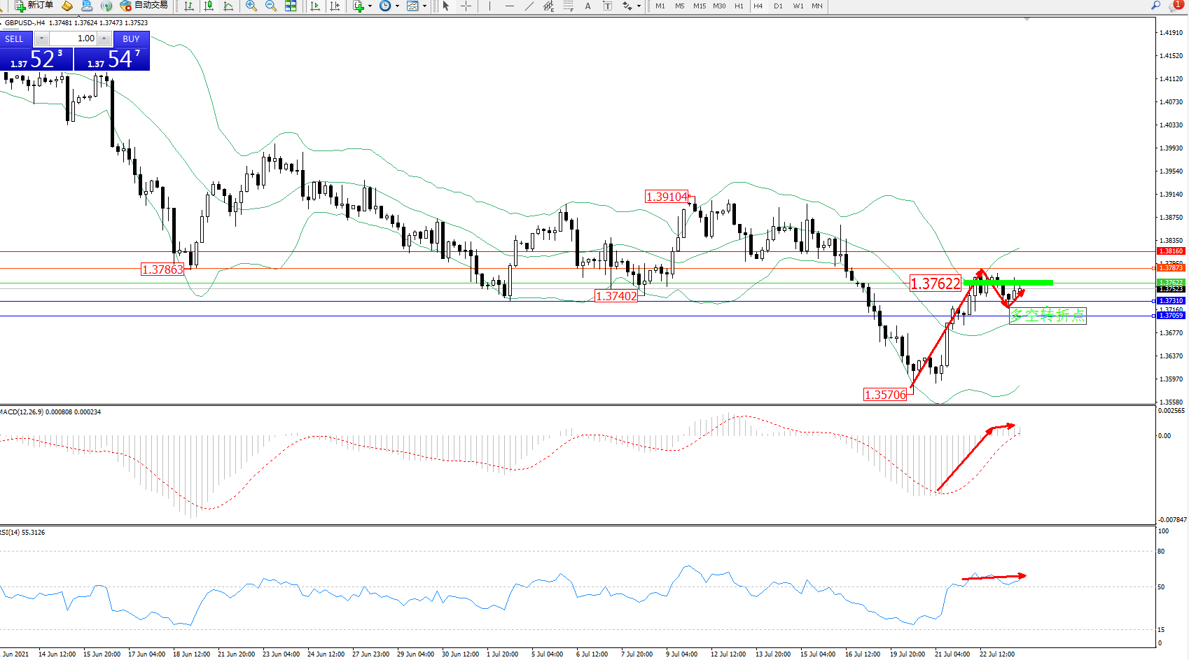 交易策略:1.37622下方看跌,目标1.37310、1.37059