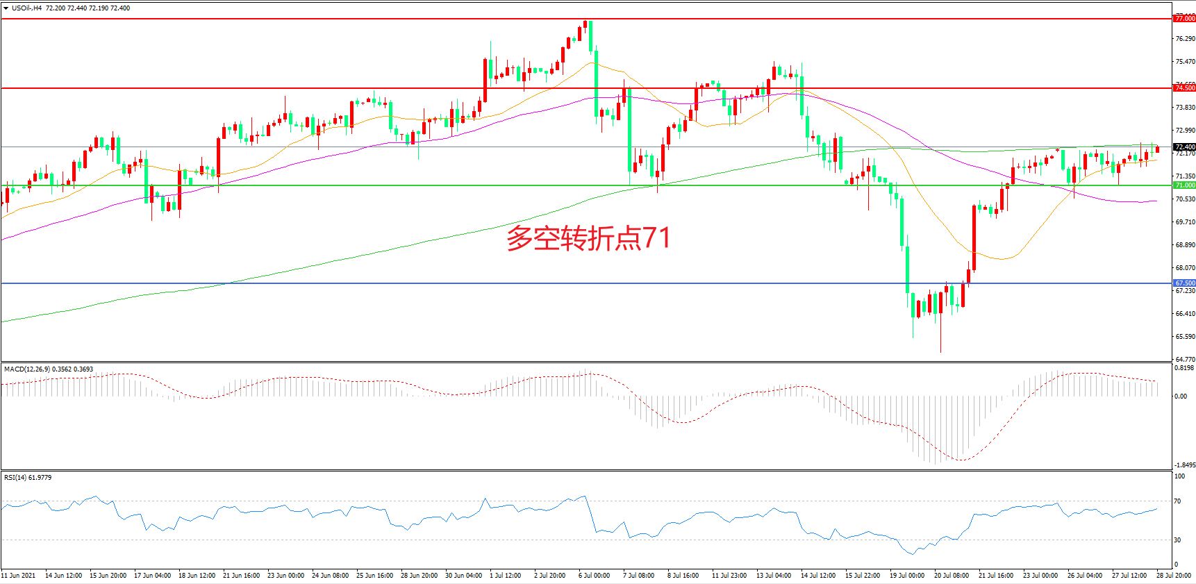 4小时图看,油价长阳拉升后延续高位震荡,200周期均线成为短期阻力,71美元成为多空分水岭,均线系统走平,MACD红柱增加,日内震荡上行概率较大。