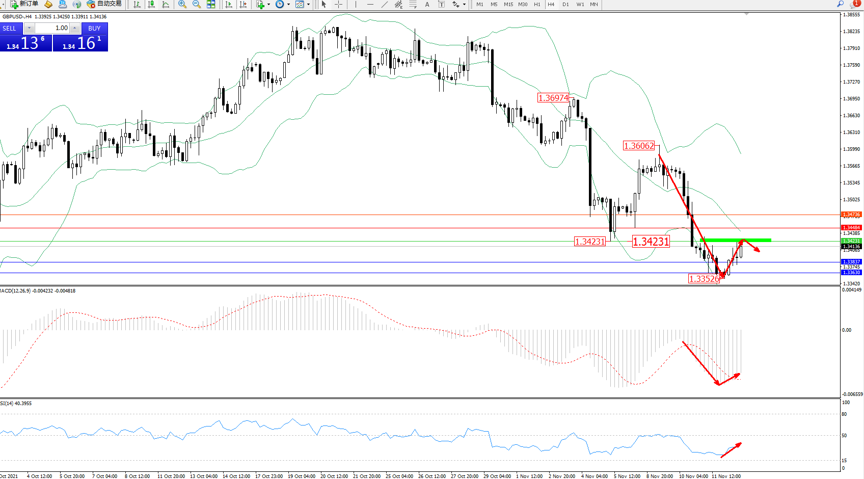 交易策略:1.34231下方看跌,目标1.33837、1.33630