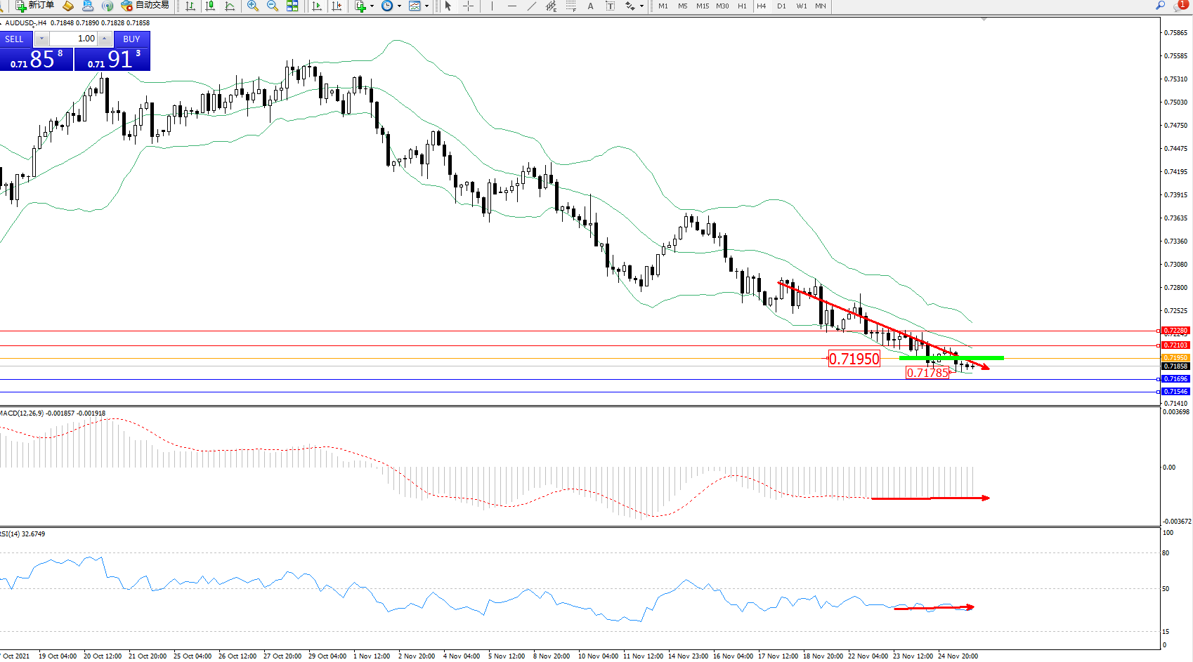 交易策略:0.71950下方看跌,目标0.71696、0.71546