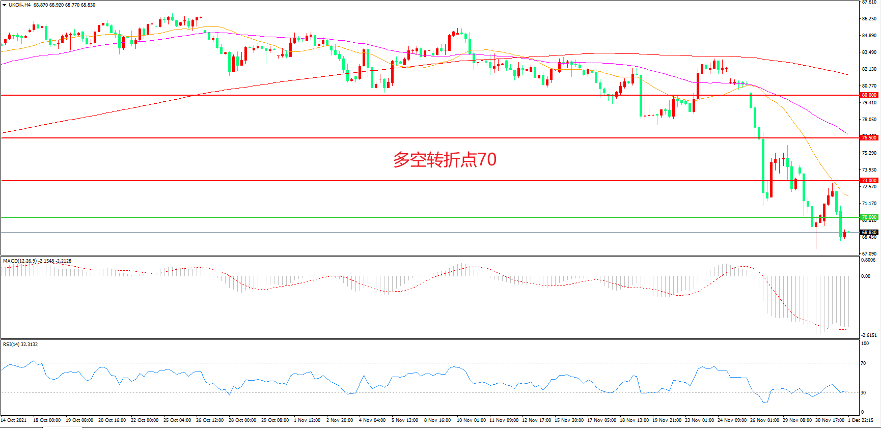 周三(12月1日),美国确认第一例奥密克戎毒株感染病例,且感染者已经完成新冠疫苗接种,疫情发展趋势再度给油价带来冲击,布伦特原油破位下行,收报68.83美元/桶。目前市场只能寄希望于OPEC会议能够给出些许的利好,比如OPEC+放弃增加40万桶的产量或者小幅的减产,否则悲观的情绪仍会持续。