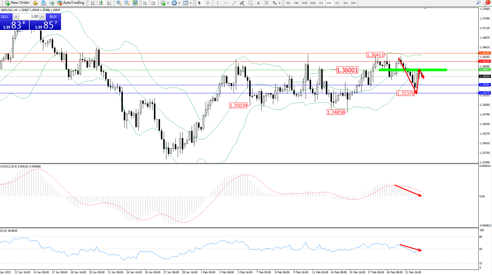 交易策略:1.36001下方看跌,目标1.35591、1.35370