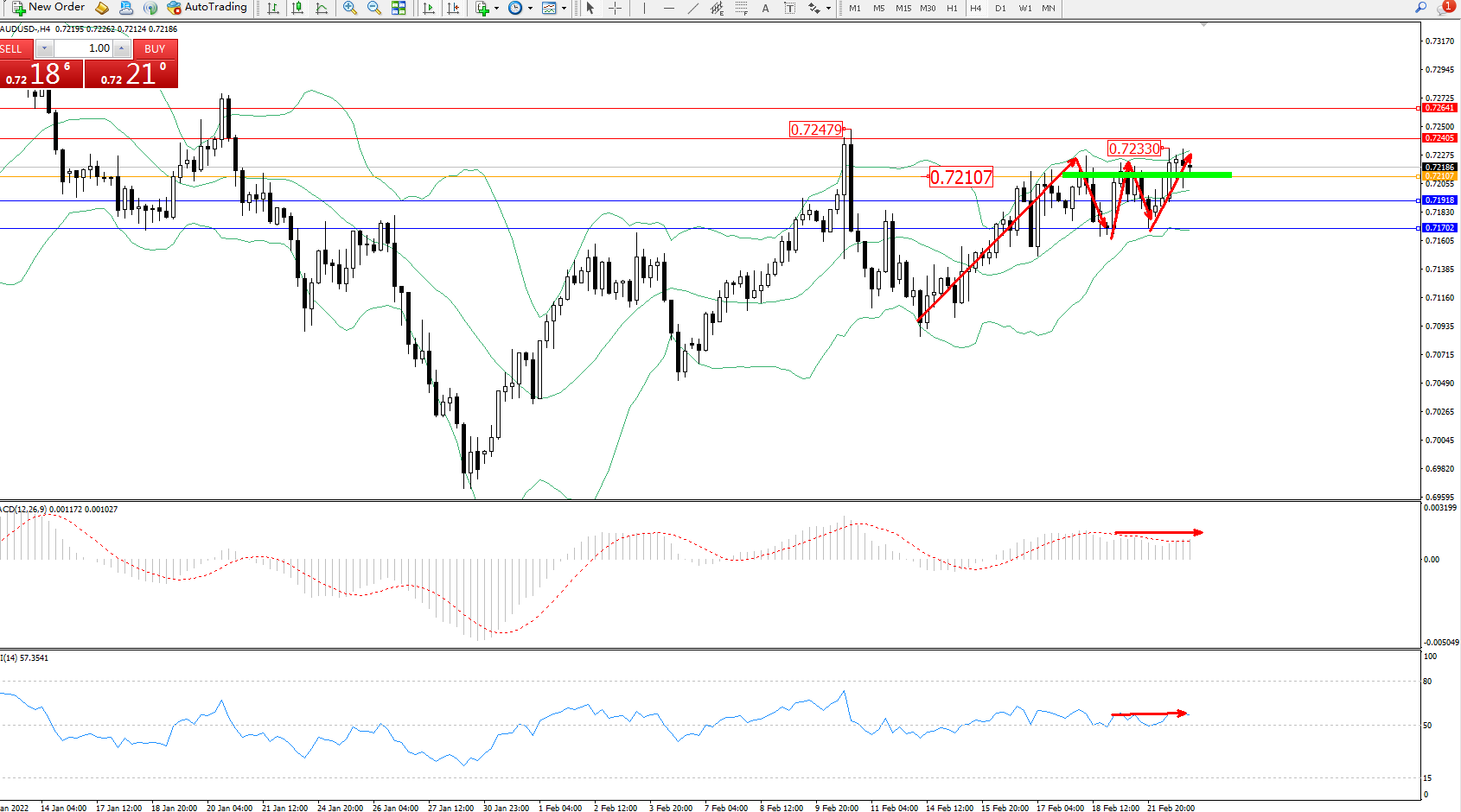 交易策略:0.72107上方看涨,目标0.72405、0.72641