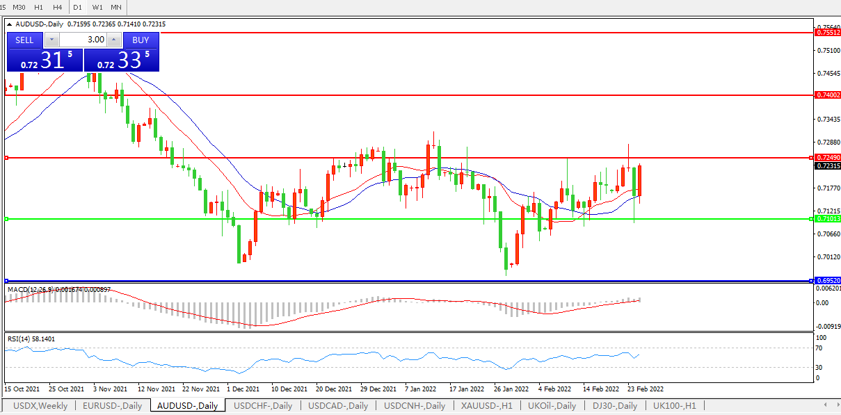 交易策略:0.7100上方看涨,目标0.7250、0.7400