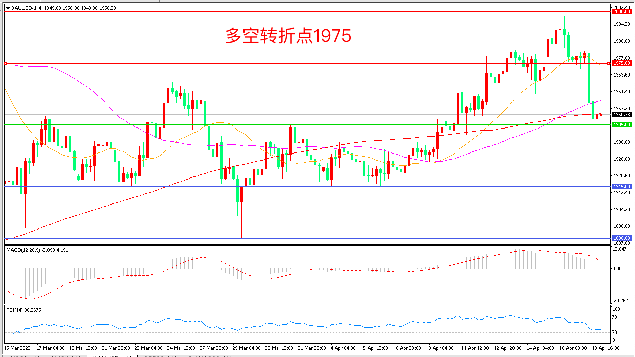 周二(4月19日),圣路易斯联储主席布拉德表示不排除加息多达75个基点之后,投资者重新评估收紧预期,美元指数飙升,现货黄金长阴下破,收报1949美元/盎司。黄金此番回调一方面是受制于美元上升的压力,另一方面也和假期后流动性回归,多头平仓结利有关,在俄乌再次开战的背景下,金价随时可能出现飙升。