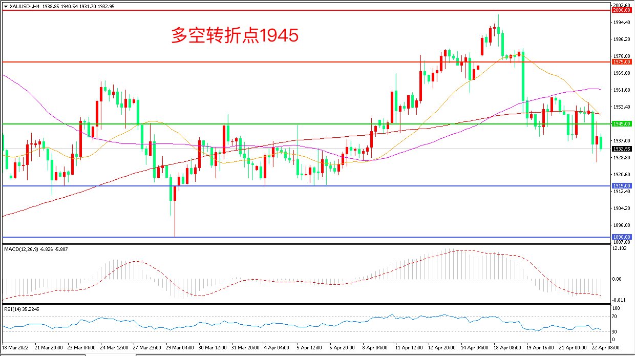 上周五(4月22日),在美联储释放强烈鹰派行动信号的背景下,美元指数再度迎来大涨,现货黄金承压下行,收报1932.95美元/盎司。面对美联储彻底转鹰和俄乌变局的一波三折,多头力量正在“撤退”,短期金价或将陷入低迷。