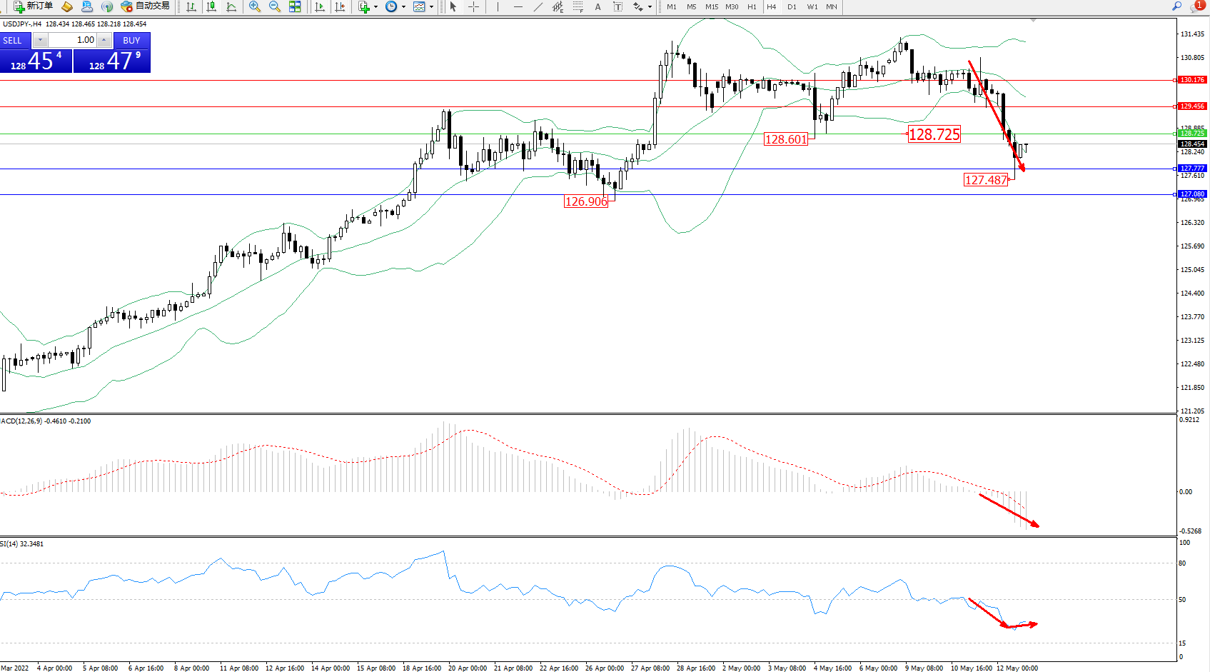 交易策略:128.725下方看跌,目标127.777、127.080