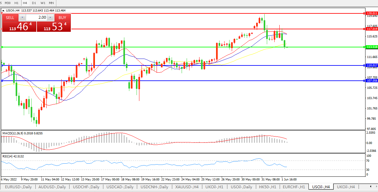 4小时图看,油价跌破均线下行,短线走势偏 MACD动能柱缩短RSI指标走,日内延续弱势概率较大。