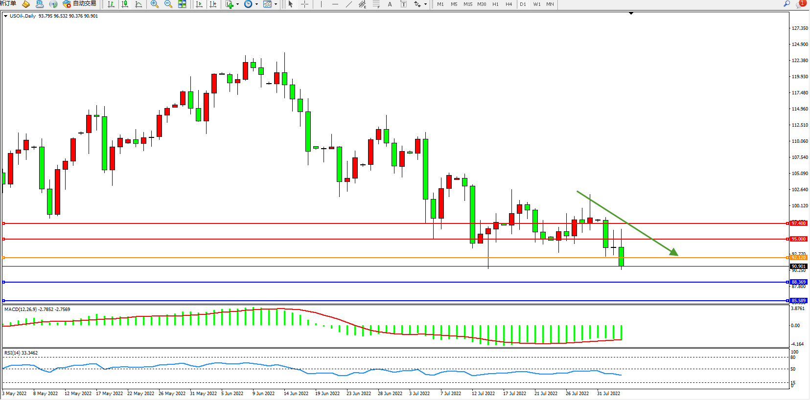 交易策略:92.120下方看跌,目标88.369、85.589