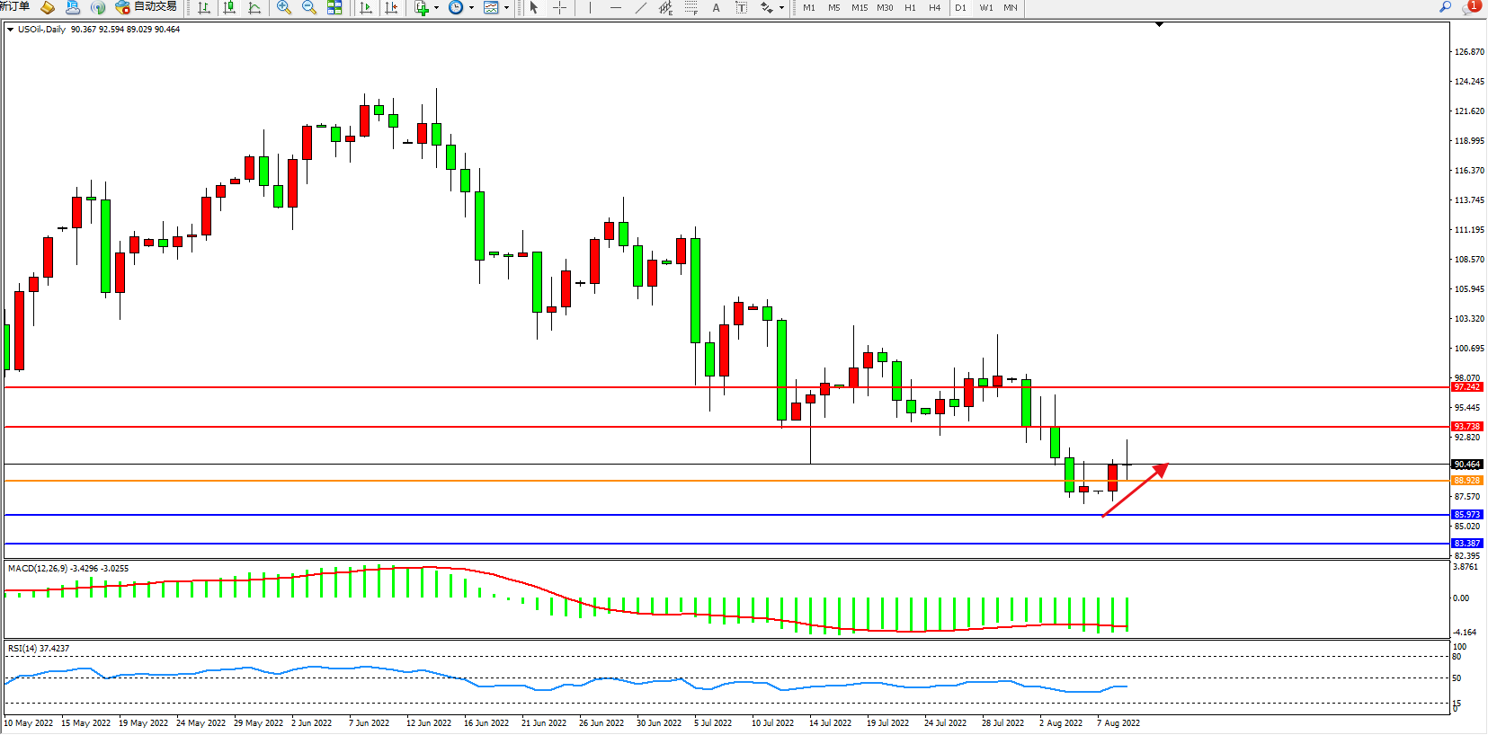 交易策略:88.928上方看涨,目标93.738、97.242