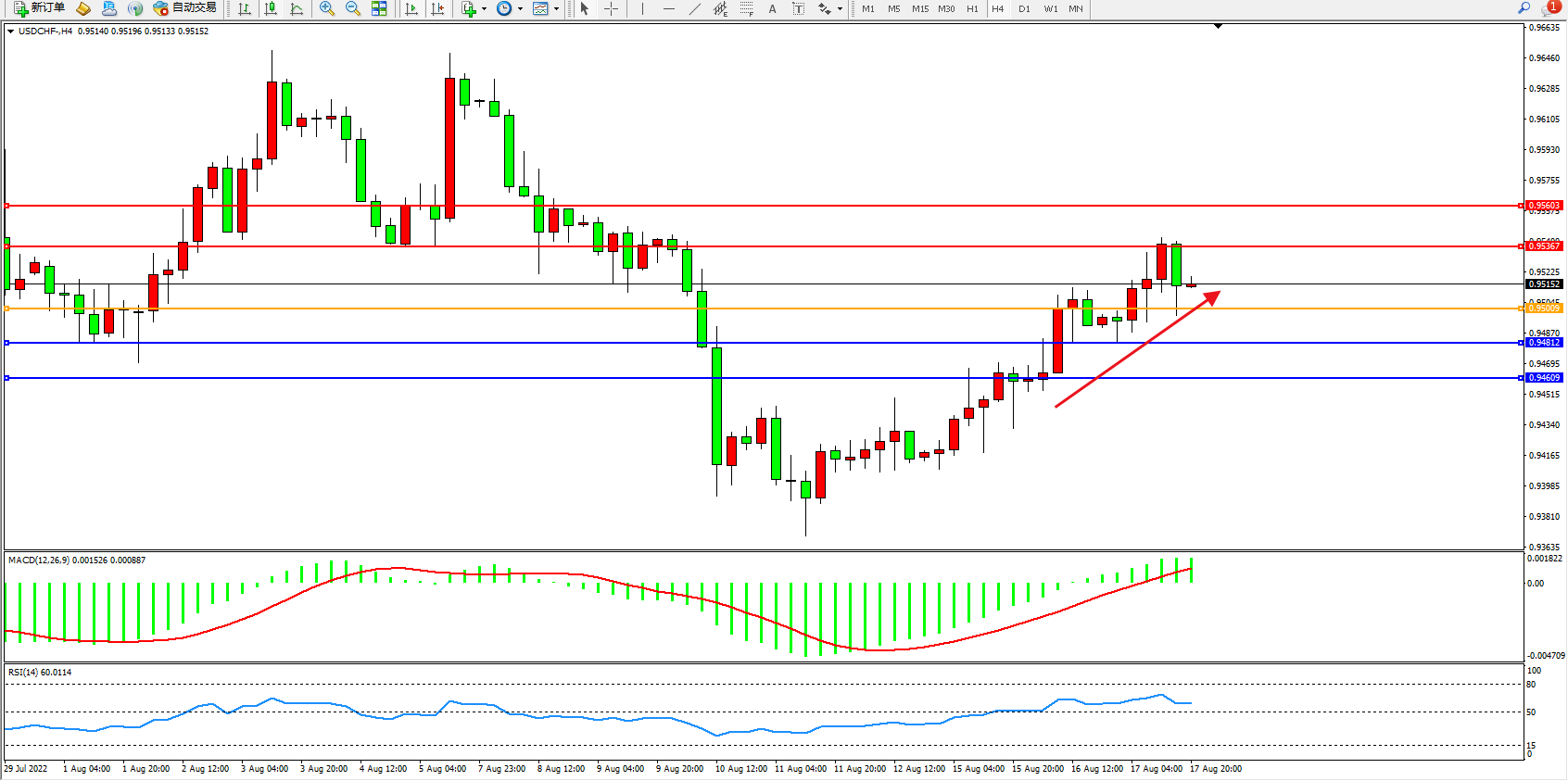 美元瑞郎USDCHF——4小时K线图显示: