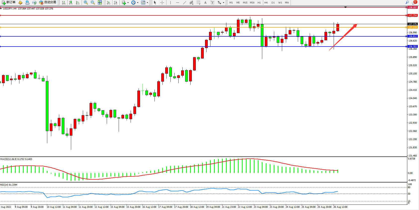 4小时图看:高位维持窄幅震荡后,多头伺机入场缓慢上移,前期高位近在咫尺破位在即,多头有继续向上拉升态势,MACD指标处于0轴线上側弱势徘徊,RSI指标处于50均衡线上側窄幅整理;