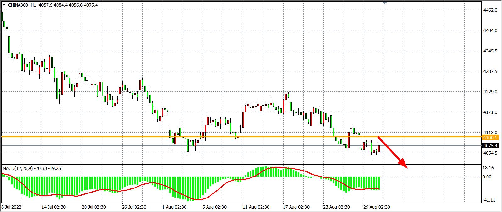 1小时图看,沪深300下破4060后再度反弹收复失地,但总体趋势走弱,MACD于零轴之下量能依旧持续放大,预示行情有进一步走低的动能,当前阻力已下移至4100一线,在4100之下看跌,目标4050-4000,上破4100看涨,目标4150-4200