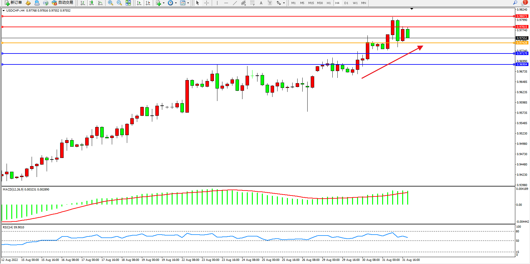 美元瑞郎USDCHF——4小时K线图显示: