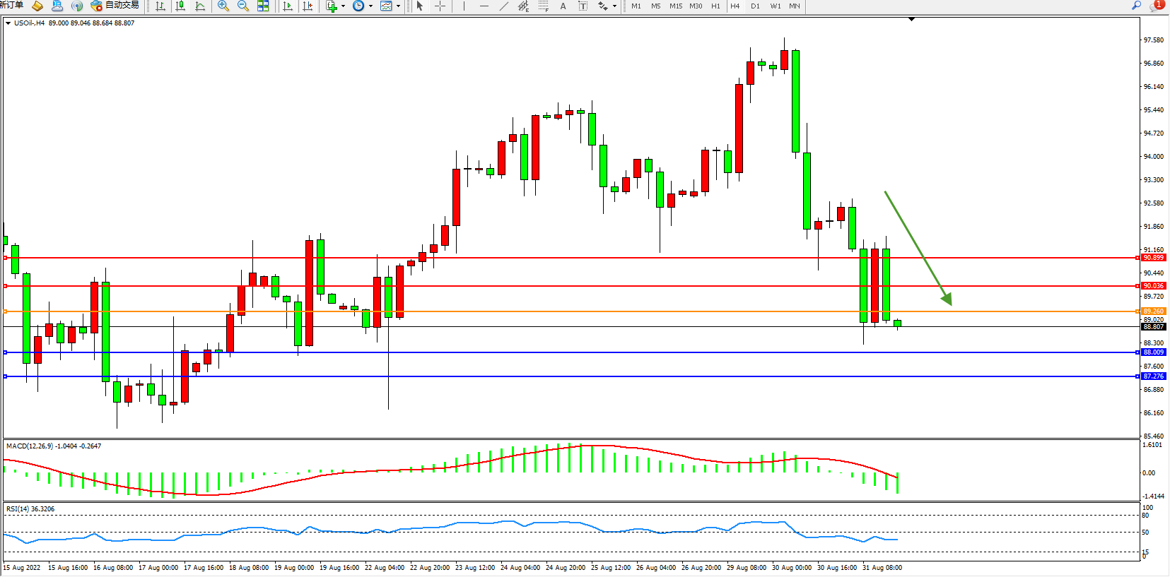 交易策略:89.260下方看跌,目标88.009、87.276