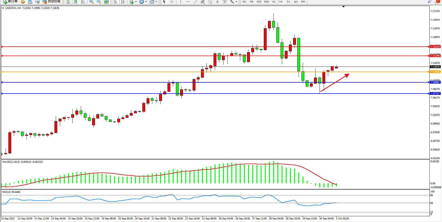 美元人民币USDCNH——4小时K线图显示: