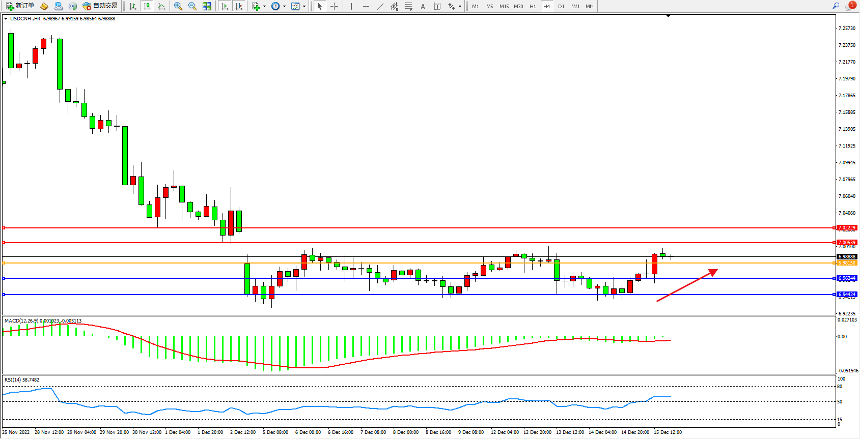 美元人民币USDCNH——4小时K线图显示: