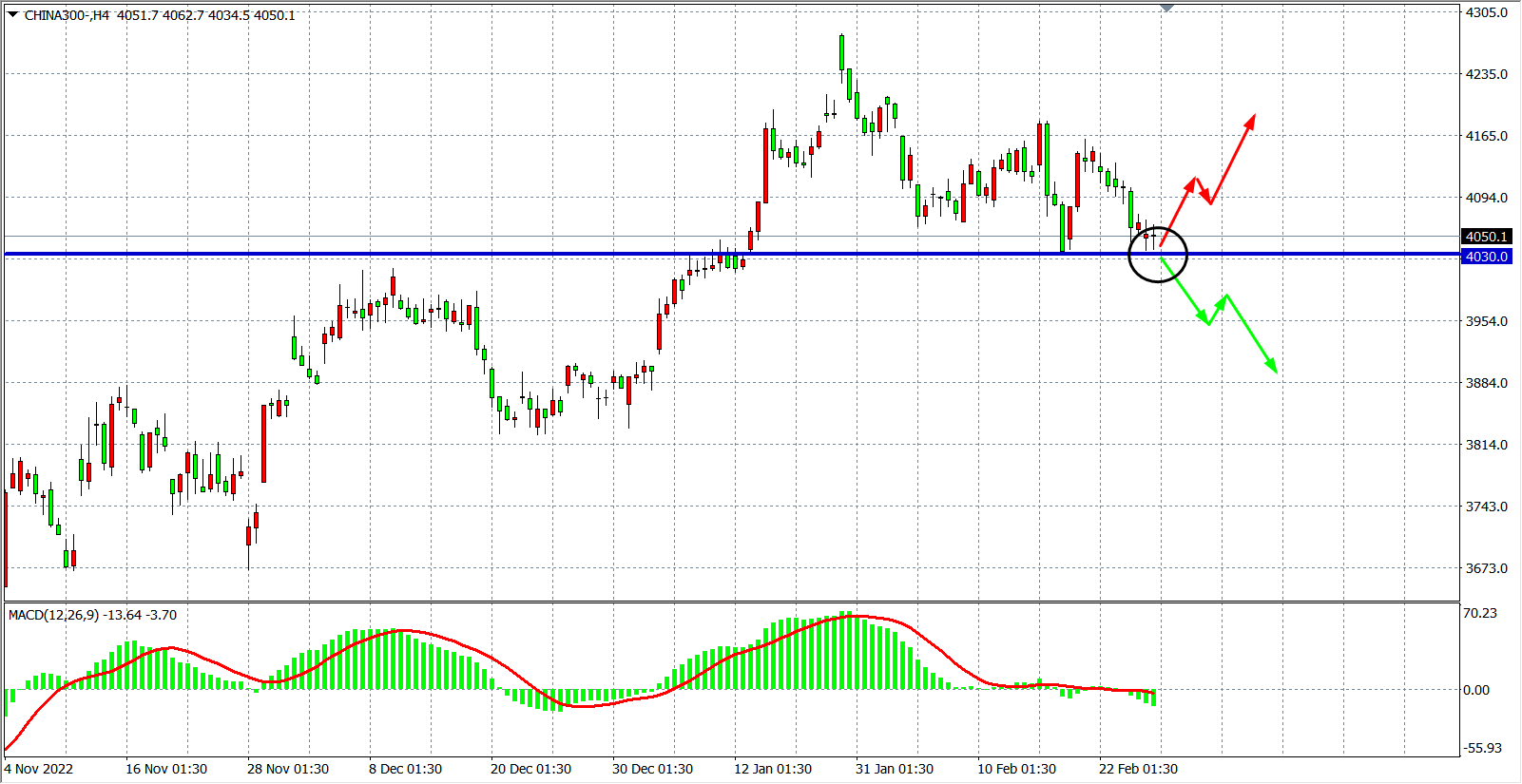 4小时图看,沪深300走势进一步疲弱,同时MACD于零轴之下维持小幅放量,当前支撑关注前低点4030附近,若该位进一步下破,后市看3980-3930附近。