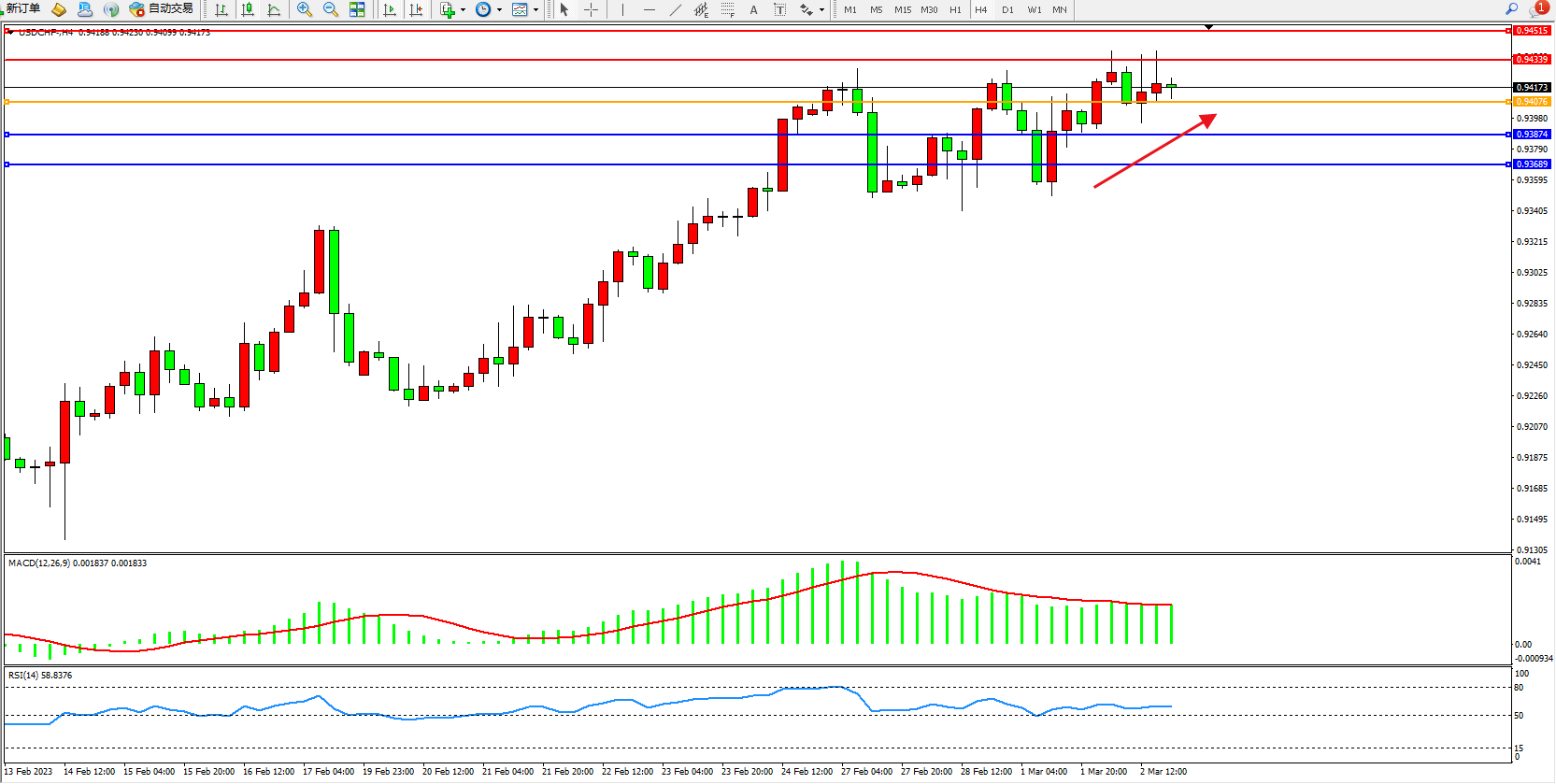 美元瑞郎USDCHF——4小时K线图显示: