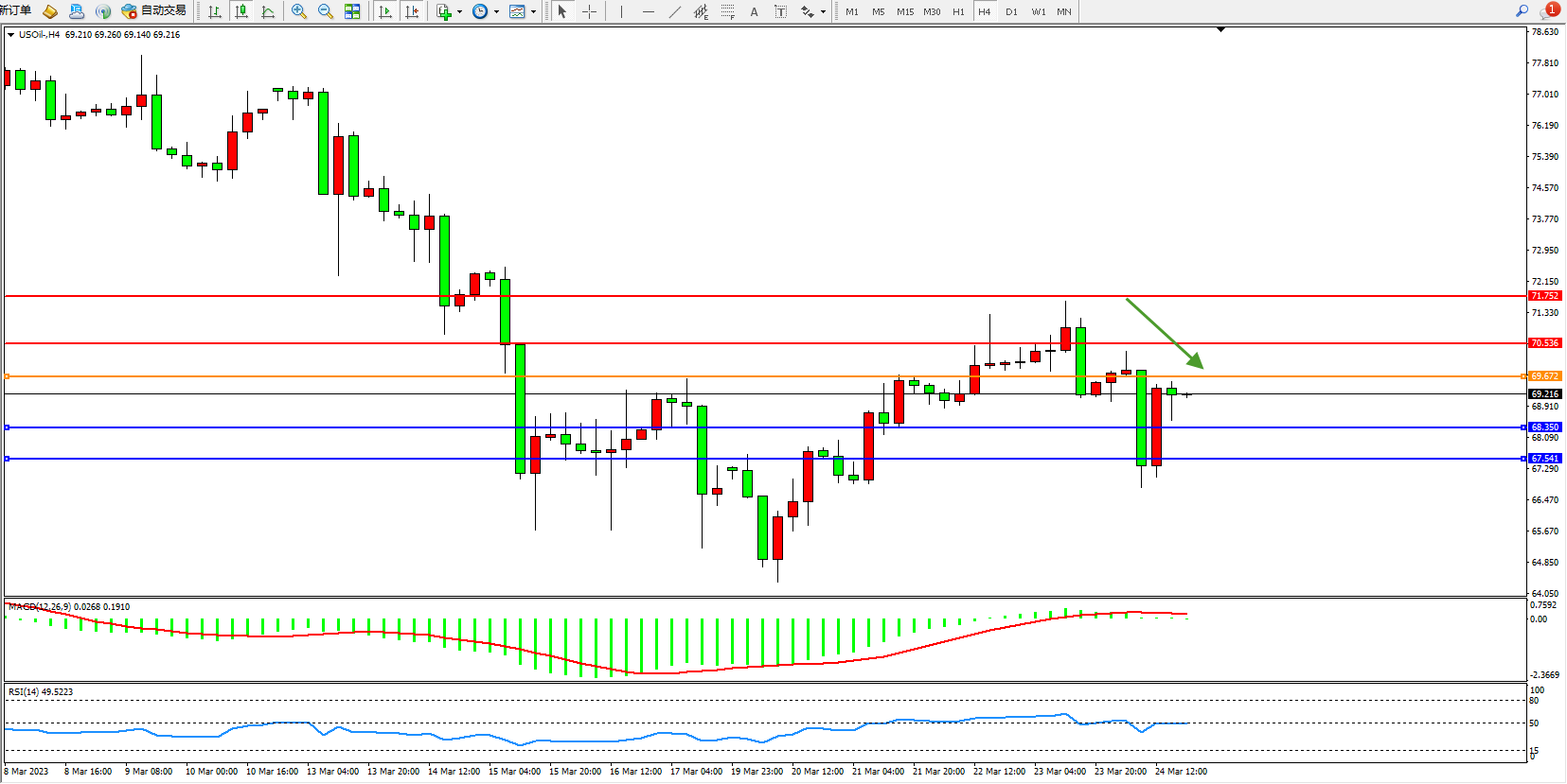 交易策略:69.672下方看跌,目标68.350  67.541