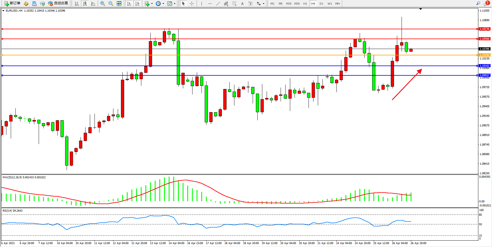 交易策略:1.10286上方看涨,目标1.10566  1.10736